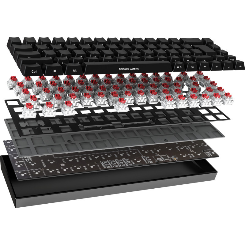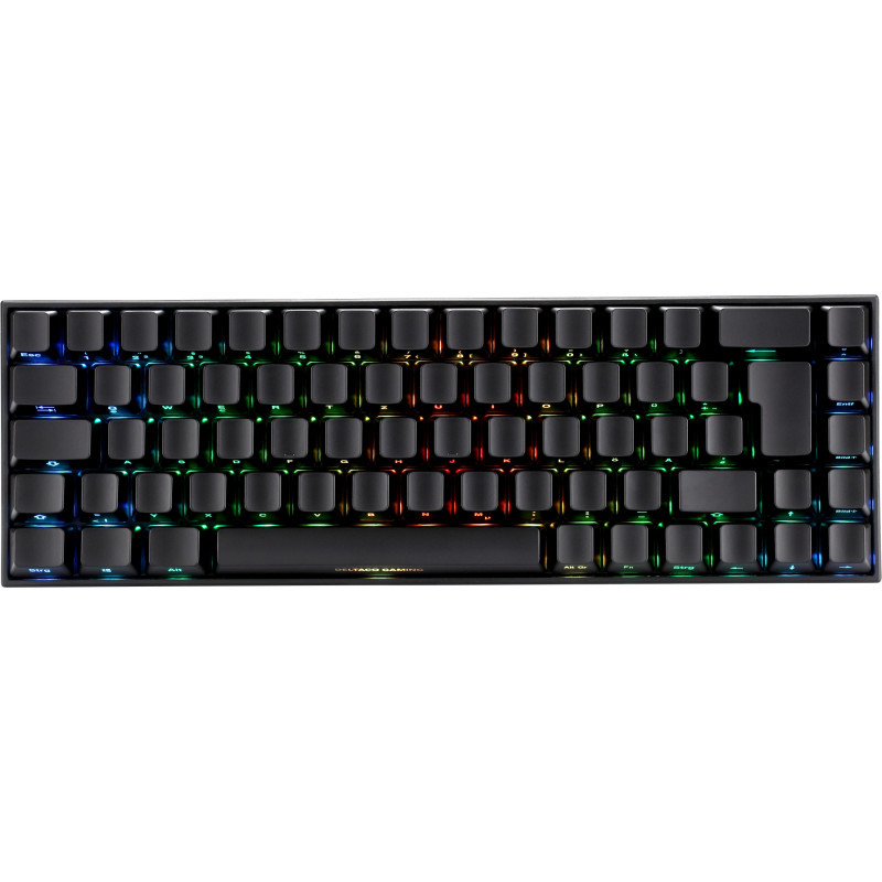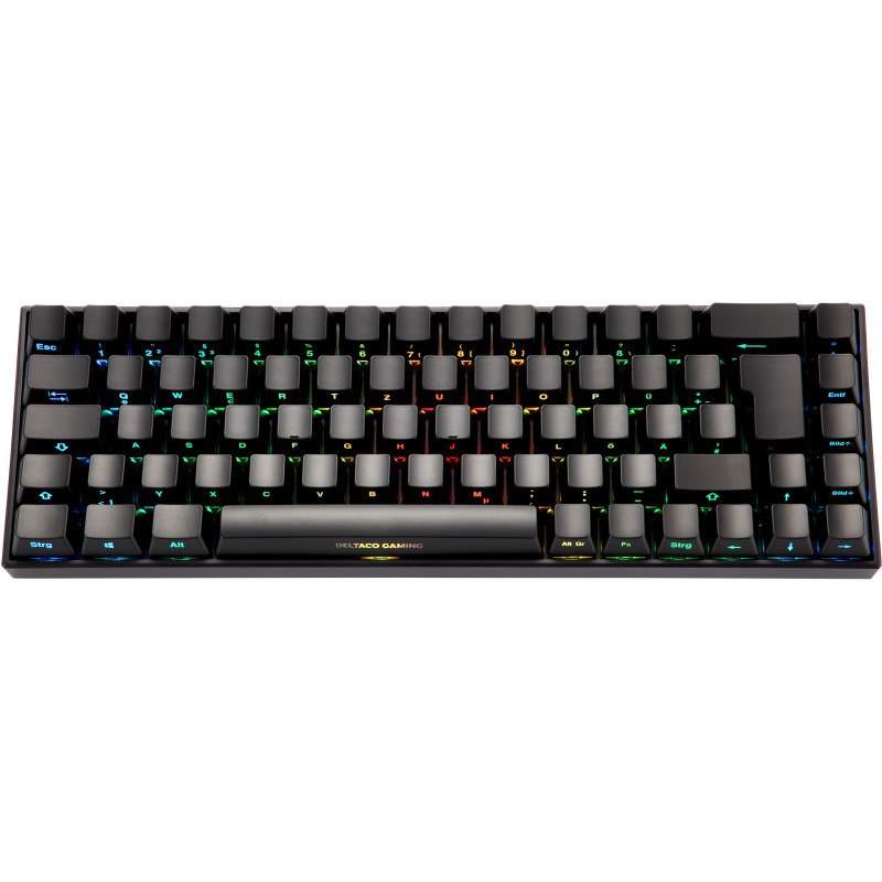 "Deltaco Gaming GAM-100-DE. Keyboard form factor: 65%. Keyboard style: Straight. Connectivity technology: Wired & Wireless, Device interface: USB + RF Wireless + Bluetooth, Keyboard key switch: Mechanical, Keyboard layout: QWERTZ, Keyboard number of keys: 68. Backlight type: RGB LED. Cable length: 1.8 m. Recommended usage: Gaming. Product colour: Black"\n"DELTACO GAMING DK440R Wireless 65% keyboard, front lasered keys, RGB, Kailh Red, N-key rollover, German Layout, black/RGB