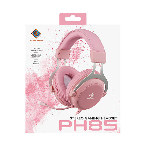 "Deltaco Gaming GAM-030-P. Product type: Headset. Connectivity technology: Wired. Recommended usage: Gaming. Headphone frequency: 20 - 20000 Hz. Cable length: 2 m. Weight: 280 g. Product colour: Pink"\n"PH85 is a headset from our pink lineup of gaming products, they come equipped with massive 57mm elements for that really immersive gaming sound. The headphone cushions are made of synthetic leather for really good comfort even during long gaming sessions.