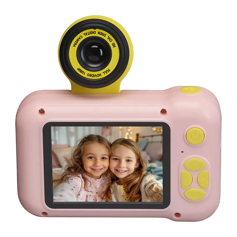 "Denver KCA-1351RO. Product type: Children's digital camera, Product colour: Pink, Yellow"\n"Spark Creativity with the DENVER KCA-1351RO Flip Lens for Selfies The DENVER KCA-1351RO features a flip lens, making it easy for young photographers to capture perfect selfies. Say cheese and snap away! High-Resolution Photos and Videos With interpolated photo resolution of up to 40 megapixels, this camera ensures sharp and vibrant images. Record videos in interpolated 1920x1080 resolution for lasting memories. Creative Filters and Frames Choose from 15 cartoon frames, 10 photo effects, and 7 color filters to add fun and flair to your photos. Let your imagination run wild! Entertainment On-the-Go Keep boredom at bay with 5 built-in games. Whether it’s waiting for the school bus or a family road trip, the DENVER KCA-1351RO keeps kids entertained. Rechargeable and Expandable The built-in rechargeable battery can be conveniently charged using the included USB-A to USB-C cable. Just add a MicroSD card (up to 64GB, not included) for video recording. Get ready for a world of creativity with the DENVER KCA-1351RO! "