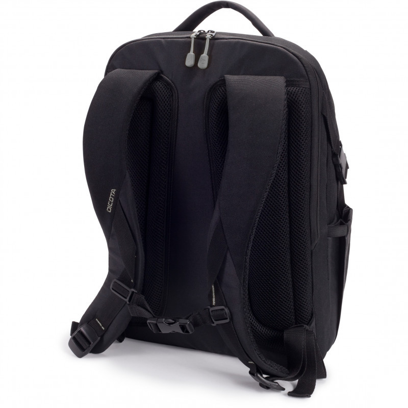 "DICOTA Eco. Case type: Backpack, Maximum screen size: 39.6 cm (15.6""), Carrying handle(s). Weight: 900 g"\n"Plenty of room in the spacious main compartment for documents and accessories. Cables can be stored in a compartment in the front pocket where you can also place accessories such as pens or mobile phone in the designated compartments. To ensure that you keep going on your journey throughout the day, it has side pockets for umbrella or water bottle and a perfect fit rain cover. For when the rain is pouring the backpack is equipped with a rain cover that is stored in a hidden pocket on the bottom of the bag. Just pull it out and put it over the bag and your belongings are safely protected from moist.