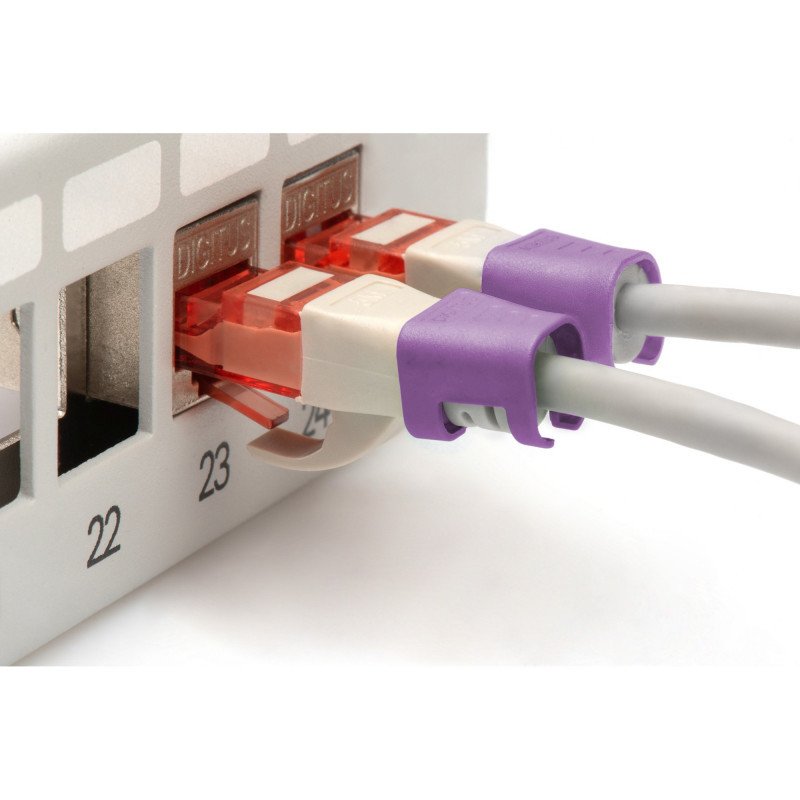 "Digitus Color clips for Patch cable - Violet. Product type: Colour coding clip, Product colour: Violet, Material: Polyvinyl chloride (PVC). Quantity per pack: 100 pc(s). Package width: 100 mm, Package depth: 120 mm, Package height: 20 mm. Country of origin: China, Package volume: 240 cm³"\n"Color clips for patch cable offer an efficient way to manage and identify cables in networking systems. They contribute to a well-organized, and easily maintainable infrastructure.