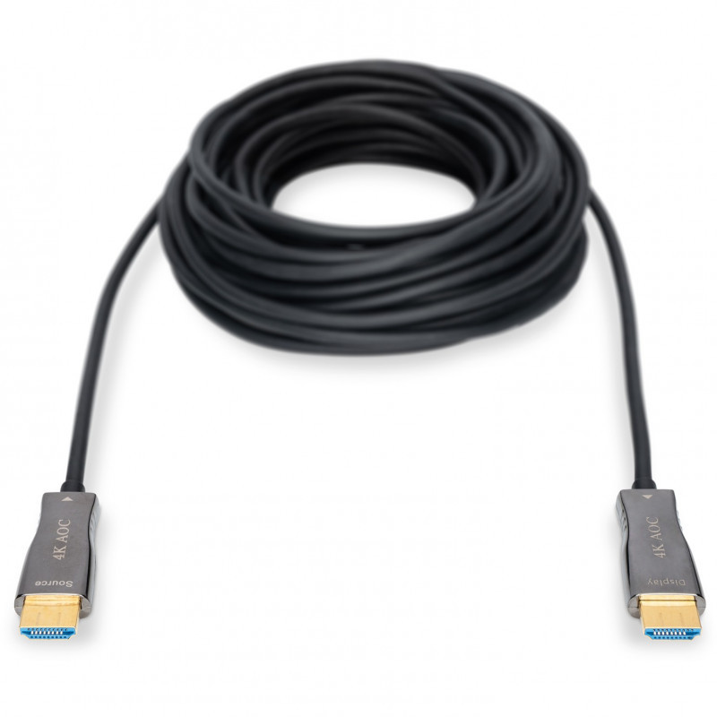 "Digitus HDMI AOC Hybrid Fiber Optic Cable, UHD 4K, 30 m. Cable length: 30 m, Connector 1: HDMI Type A (Standard), Connector 1 gender: Male, Connector 2: HDMI Type A (Standard), Connector 2 gender: Male, Connector contacts plating: Gold, HDMI version: 2.0b, 3D, Maximum resolution: 4096 x 2560 pixels, Data transfer rate: 18 Gbit/s, Audio Return Channel (ARC), Product colour: Black"\n"Transfer of uncompressed video and audio signals over a distance of up to 30 m in UHD 4K resolution with 18 Gbps bandwidth.