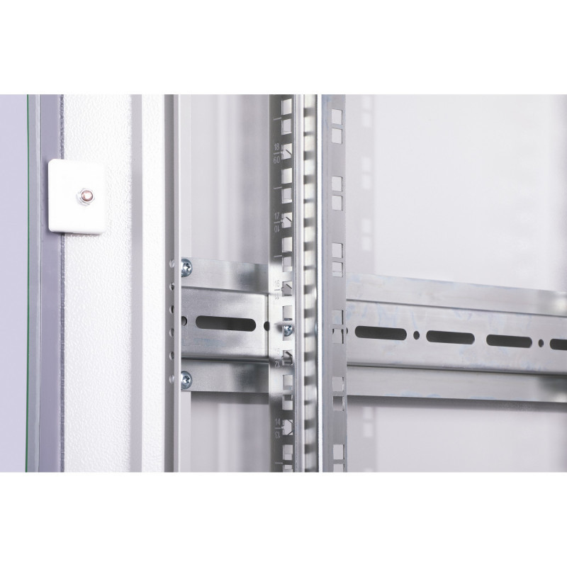 The network cabinets in the Unique series have been designed and produced for particularly convenient and flexible network cabling. Sophisticated optimizations offer market-compliant stability with maximum flexibility. A modular base chassis, which can be opened using screwed 483 mm (19"") blind panels, offers sufficient space for cables of all kinds. In addition, there are cable inlets with brushes in the rear area of the base chassis. Rear brush strips above and below the rear door (from 26U) enable use in a wide range of application scenarios. Generous vertical cable ducts with cable routing aids and cover, installed in the front (from 800 mm enclosure width), perfectly round off the versatile features of the network enclosure. Two pairs of cranked and galvanized 483 mm (19"") profile rails, labelled with height units that can be read in opposite directions, are installed inside. They are infinitely adjustable and are connected to additional depth struts in the cabinet. Each enclosure is a robust steel construction made from sheet steel up to 1.5 mm thick. The coloring takes the form of electrostatic powder coating in the standard colors grey (RAL 7035) and black (RAL 9005). Modular lockable and removable side panels and doors improve accessibility. Door hinges can be changed. Furthermore, the cabinets can be completely dismantled if required thanks to the demountable design."