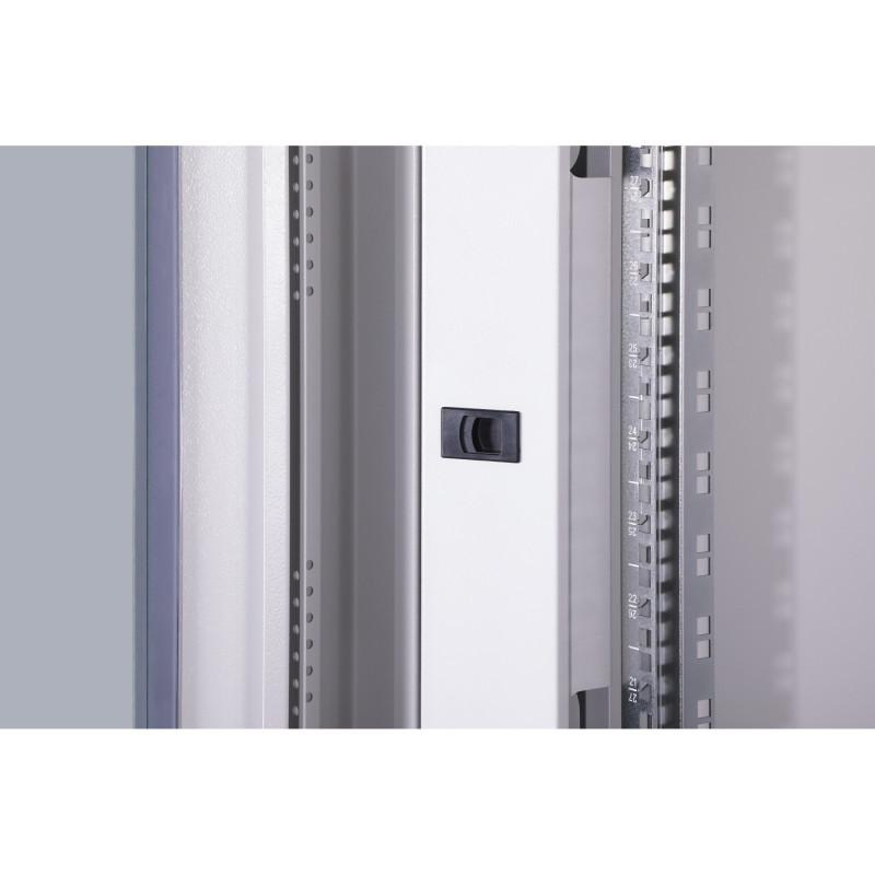The network cabinets in the Unique series have been designed and produced for particularly convenient and flexible network cabling. Sophisticated optimizations offer market-compliant stability with maximum flexibility. A modular base chassis, which can be opened using screwed 483 mm (19"") blind panels, offers sufficient space for cables of all kinds. In addition, there are side cable inlets with brushes at the top and bottom of the enclosure, as well as another at the rear of the base chassis. Rear brush strips above and below the rear door (from 26U) enable use in a wide range of application scenarios. Generous vertical cable ducts with cable routing aids and cover, installed in the front (from 800 mm enclosure width), perfectly round off the versatile features of the network enclosure. Two pairs of cranked and galvanized 483 mm (19"") profile rails, labelled with height units that can be read in opposite directions, are installed inside. They are infinitely adjustable and are connected to additional depth struts in the cabinet. Each enclosure is a robust steel construction made from sheet steel up to 1.5 mm thick. The coloring takes the form of electrostatic powder coating in the standard colors grey (RAL 7035) and black (RAL 9005). Modular lockable and removable side panels and doors improve accessibility. Door hinges can be changed. Furthermore, the cabinets can be completely dismantled if required thanks to the demountable design."