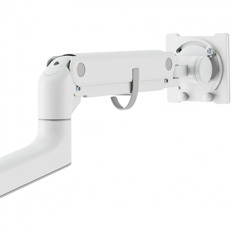 Single monitor mount - Fully mobile, resilient, space-saving The fully mobile table mount for single monitors impresses with its robust heavy-duty construction and reliably supports flat or curved screens up to 57 inches in size and weighing up to 27 kg. The integrated gas spring system with adjustable spring tension mechanism allows the monitor to be positioned effortlessly and precisely - according to individual requirements. With a generous range of movement, the mount allows the monitor to be tilted, swiveled, rotated and infinitely adjusted in height, ensuring ergonomic working and optimum viewing comfort. The VESA quick-release function allows the screen to be mounted or removed quickly and without tools, while the quick-release coupling ensures that the arms can be installed quickly. The mount is fully top-mounted on the desk and offers two flexible mounting options - both via a desk clamp and a grommet. Thanks to the integrated cable management, the workstation always remains tidy. An additional pole mount extends the adjustment options and rounds off the functional design."