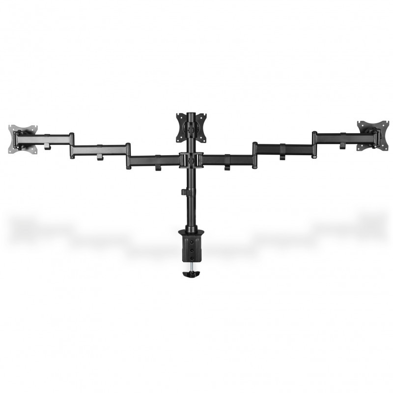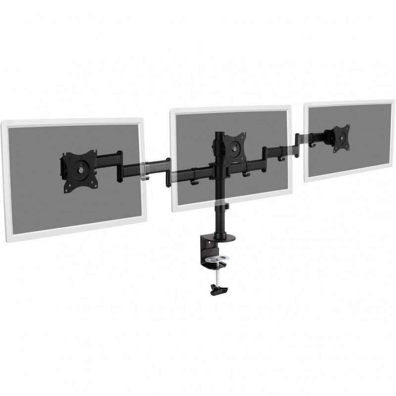 "Digitus Triple monitor mount, 3x 27"", 3x 8 kg. Mounting: Clamp, Maximum weight capacity: 8 kg, Maximum screen size: 68.6 cm (27""), Minimum VESA mount: 75 x 75 mm, Maximum VESA mount: 100 x 100 mm. Height adjustment, Tilt angle range: 0 - 45°. Product colour: Black"\n"Universal triple monitor stand with clamp mount up to 69cm (27"")