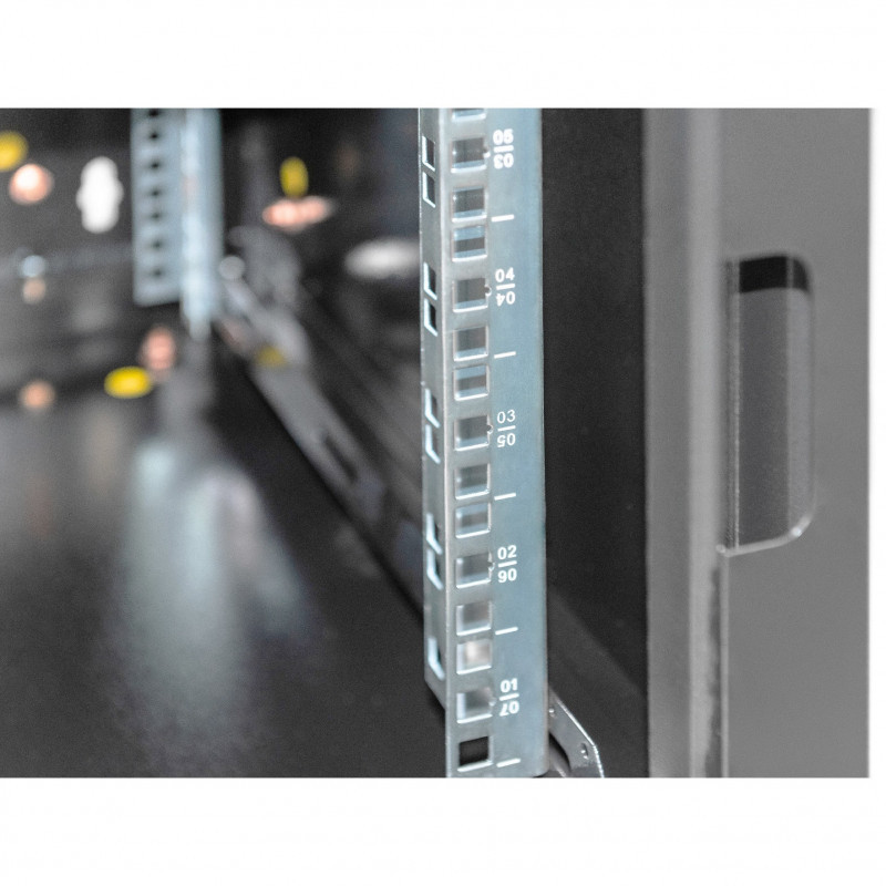 The network cabinets for wall installation from the Unique series were developed for especially convenient and flexible network cabling. There is a sliding cable inlet with foam rubber seal in the roof of each cabinet. The back wall and floor plate are equipped with pre-cut cable inlets with a plastic cover. To accommodate a fan module, the roof structure is also equipped with a pre-cut area. Two pair of galvanized 483 mm (19”) profile rails labeled with rack units readable in both directions are installed on the inside. Their depth can be adjusted. Each cabinet is made of up to 1.5 mm thick sheet steel. Coloring is done with electrostatic powder coating in the standard colors gray (RAL 7035) or jet black (RAL 9005). Removable and lockable side walls in a modular design as well as lockable and removable front door improve accessibility. The door hinges can be switched. Wall installation is accomplished in two easy work steps: The housing frame plate is bolted on the wall and then connected with the housing. With optionally available levelling feet or casters, the wall housings from the Unique series can also be used as a free-standing unit."