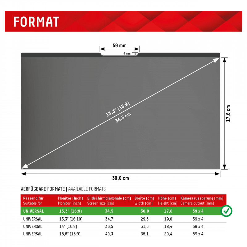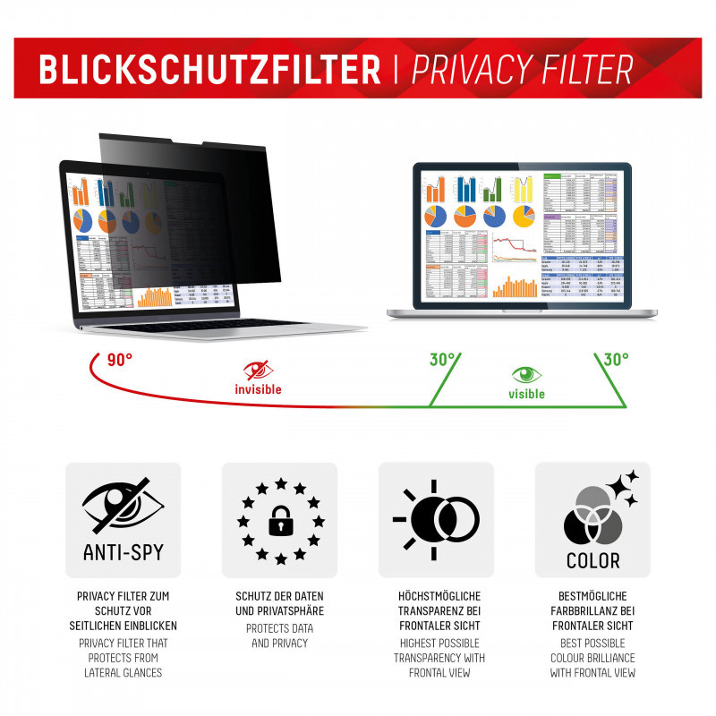 "Displex PRIVACY SAFE magnetic 2-way privacy filter for Laptop/ Notebook 13,3'' (16:9). Maximum screen size: 33.8 cm (13.3""). Aspect ratio: 16:9. Suitable for: Laptop, Type: Frameless display privacy filter. Surface finish: Glossy / Matt, Protection features: Dust resistant, Scratch resistant, Hardness: 5H, Limits viewing angle: 30°"\n"Highly effective 2-way privacy filter protects the screen from scratches and damage and limits the field of view to+/- 30°. I.e. from an angle of approx. 30° the display appears black, so that your privacy and sensitive data are protected from unwanted side views, compliance with the General Data Protection Regulation (GDPR) is supported.