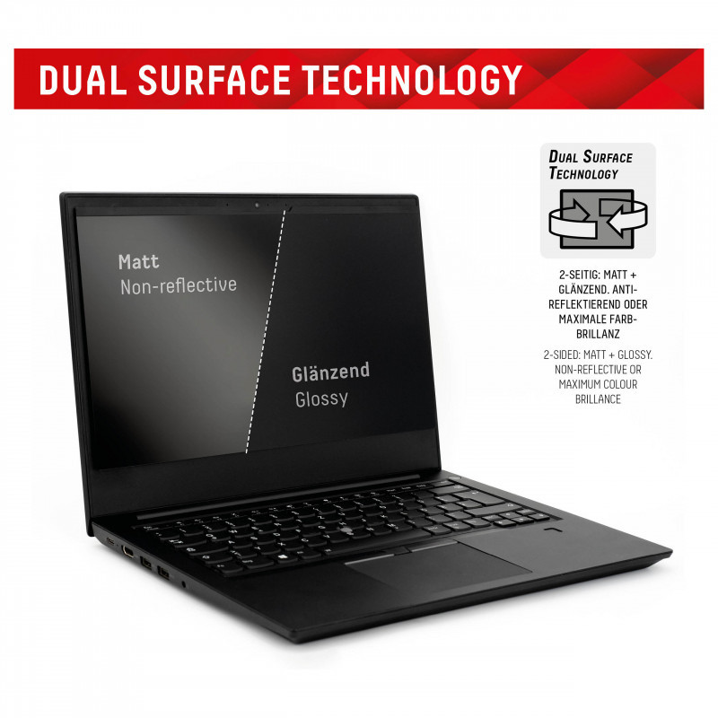 Dual Surface Technology: the Privacy Safe privacy filter has 2 different turnable sides. The matt anti-reflective surface allows non-reflective, glare-free use (especially in bright light) and reduces annoying fingerprints. The other, glossy side provides a clearer view of the screen and maximum colour brilliance, especially indoors and in medium to dark light conditions.