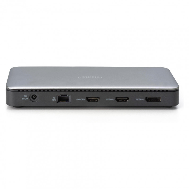 "Digitus USB-C docking station, 11-port. Connectivity technology: Wired, Host interface: USB 3.2 Gen 2 (3.1 Gen 2) Type-C, HDCP version: 1.4/2.2. Ethernet LAN data rates: 10,100,1000 Mbit/s. Product colour: Black, Grey, Compatible memory cards: MicroSD (TransFlash), SD, Data transfer rate: 10 Gbit/s. Power source type: DC, Power consumption (max): 150 W, Power cable length: 1 m. Mobile operating systems supported: Android, iOS, Other operating systems supported: ChromeOS"\n"Our docking station offers an ideal solution for office applications - expand your notebook connections and benefit from the triple monitor function, fast data transfer and a wide range of connection options