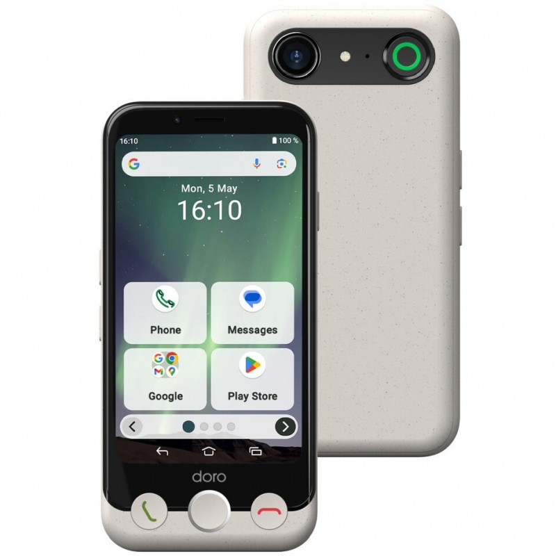 "Doro Aurora A10. Display diagonal: 11.4 cm (4.5""), Display resolution: 1280 x 720 pixels. Processor frequency: 2 GHz, Processor family: MediaTek, Processor model: MT6769Z. RAM capacity: 4 GB, Internal storage capacity: 64 GB. Rear camera resolution (numeric): 13 MP, Rear camera type: Single camera. SIM card capability: Dual SIM. Operating system installed: Android 14. Battery capacity: 3000 mAh. Product colour: Black, White. Weight: 170.4 g"\n"Doro Aurora A10