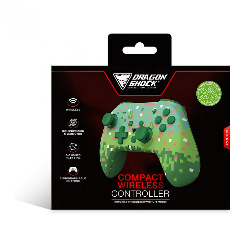 "Dragonshock PopTop. Device type: Gamepad, Gaming platforms supported: Nintendo Switch, PC, Gaming control function buttons: D-pad, Home button, Turbo button, Reset button, Start button. Connectivity technology: Wireless, Device interface: Bluetooth, USB connector type: USB Type-C. Product colour: Green, Dark Green, Pink, White, Cable length: 2 m. Power source: Battery, Battery type: Built-in, Battery technology: Lithium-Ion (Li-Ion). Weight: 165 g"\n"Venture into pixel worlds where every block builds your legacy. The PopTop Green Cube blends iconic cube-style aesthetics with pro-level features for Nintendo Switch™ gamers who live to create, explore, and conquer.