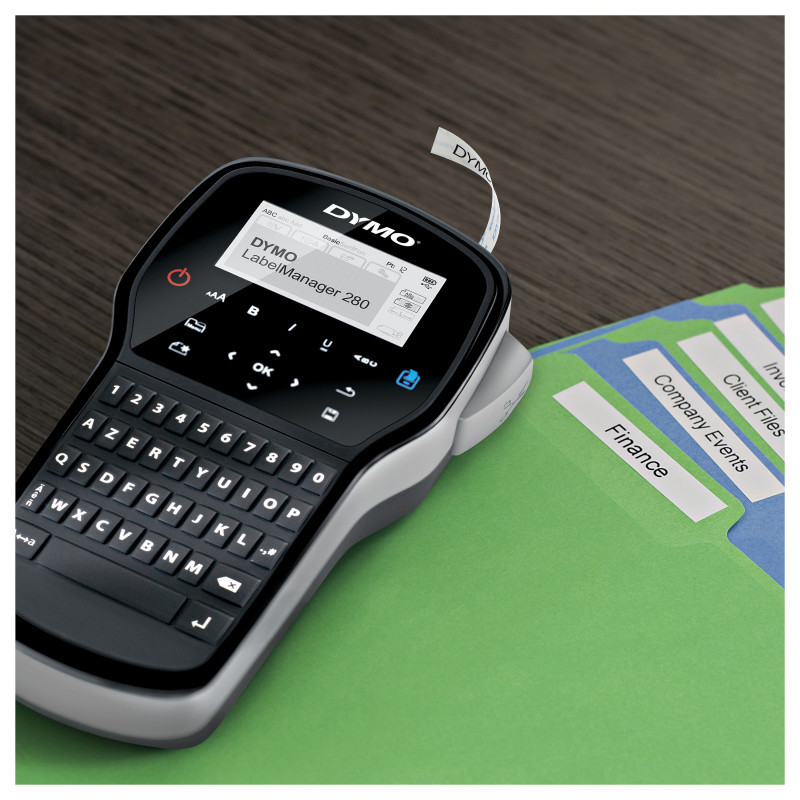 "DYMO LabelManager ™ 280 QWERTZ. Print technology: Thermal transfer, Maximum resolution: 180 x 180 DPI, Print speed: 15 mm/sec. USB port. Keyboard layout: QWERTZ. Tape type: D1. Supported paper width: 6, 9, 12 mm. Product colour: Black, Silver"\n"CREATE LABELS FAST WITH SMART KEYS