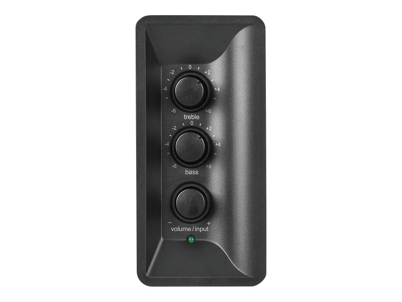 Redesigned remote with new features; Speaker cable connects the speakers together; Wood finish; On-Board Controls |
