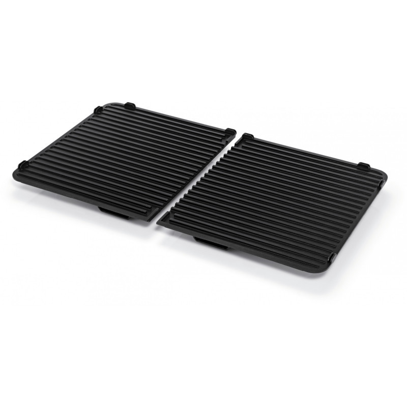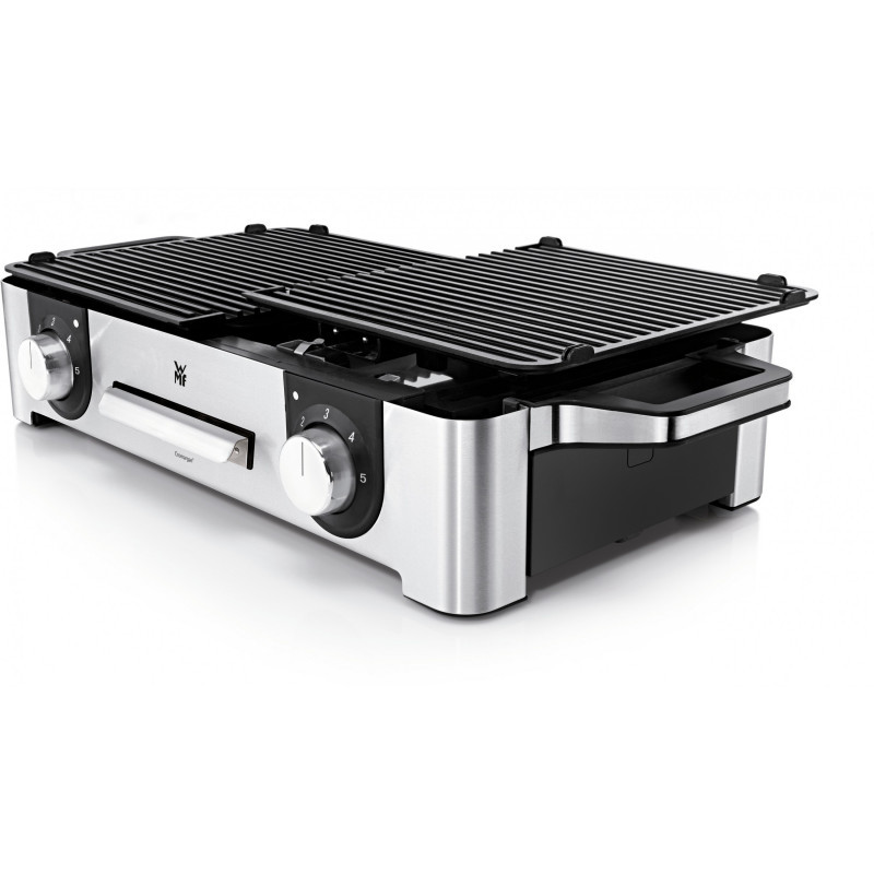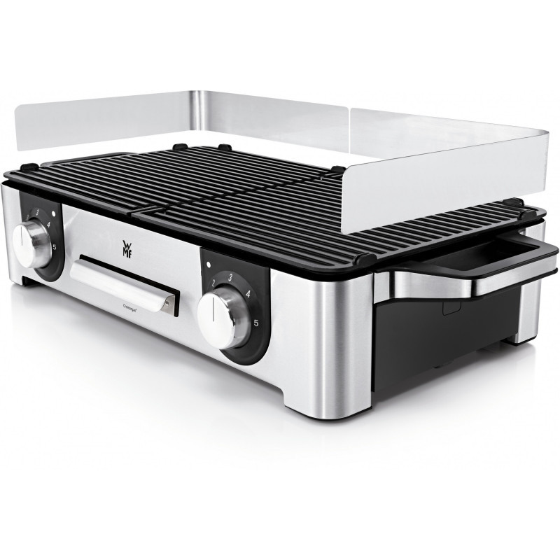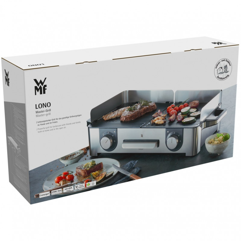 The WMF LONO Master Grill made of matt Cromargan is ideal for grilling enjoyment inside and outdoors. With a 28 x 50 cm grill area, the LONO Master Grill offers plenty of space for preparing large and varied grilled dishes. It has two separate ribbed grill plates whose temperatures can be freely adjusted using separate controls with LED lighting. In the LONO Master Grill, the heating element is also built into the two extra thick cast aluminium grill plates. The LONO Master Grill not only offers plenty of space, its 2,400 watt output guarantees perfect grill results. The removable fat collection tray and the two grill plates are dishwasher safe. It is also equipped with a removable wind and splash guard for outdoor use."