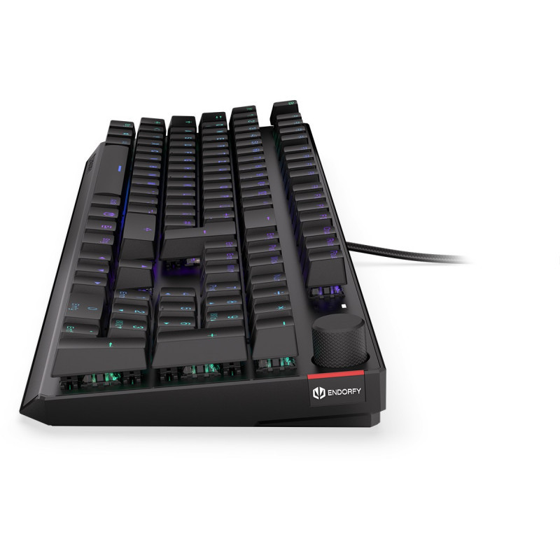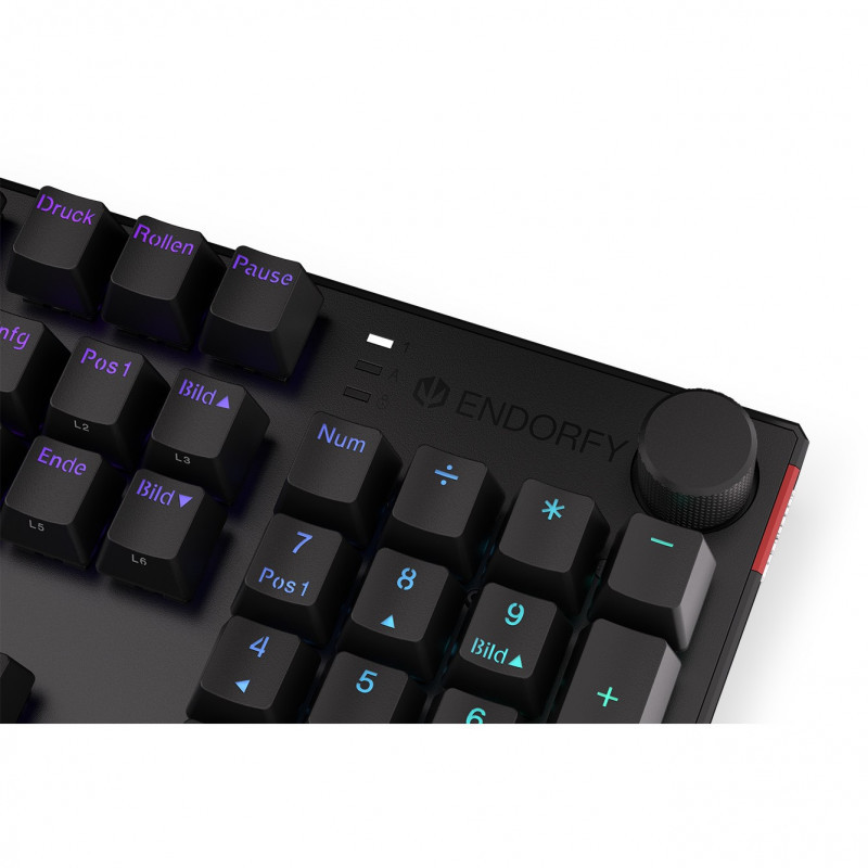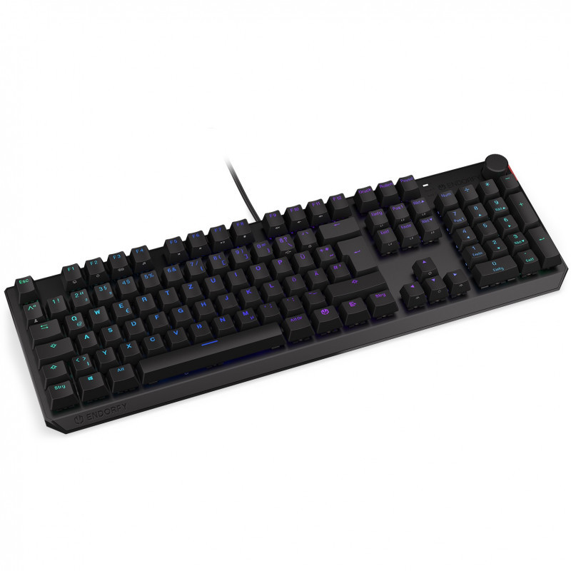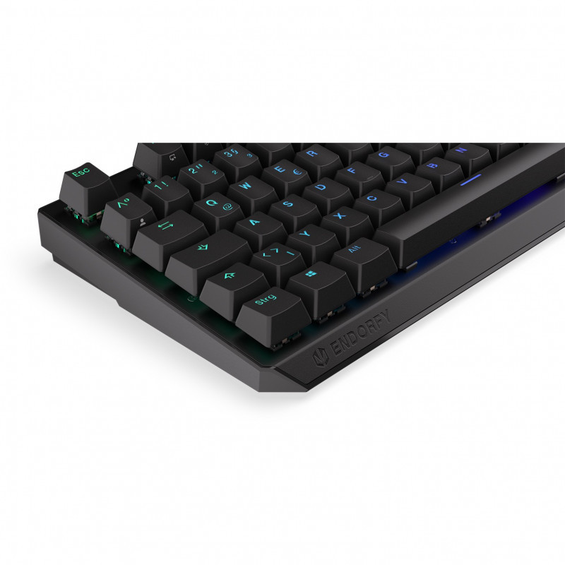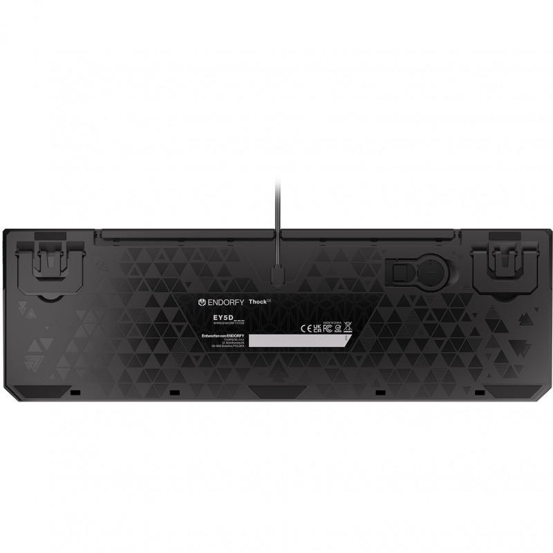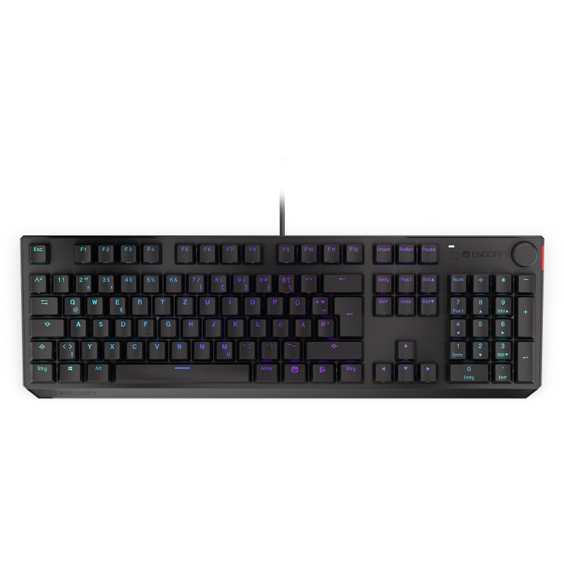 "ENDORFY Thock. Keyboard form factor: Full-size (100%). Keyboard style: Straight. Connectivity technology: Wired, Device interface: USB, Keyboard key switch: Mechanical, Keyboard layout: QWERTZ, Keyboard number of keys: 104. Backlight type: RGB LED, Wrist rest. Cable length: 1.8 m. Recommended usage: Gaming. Product colour: Black"\n"Thock DE Kailh Red