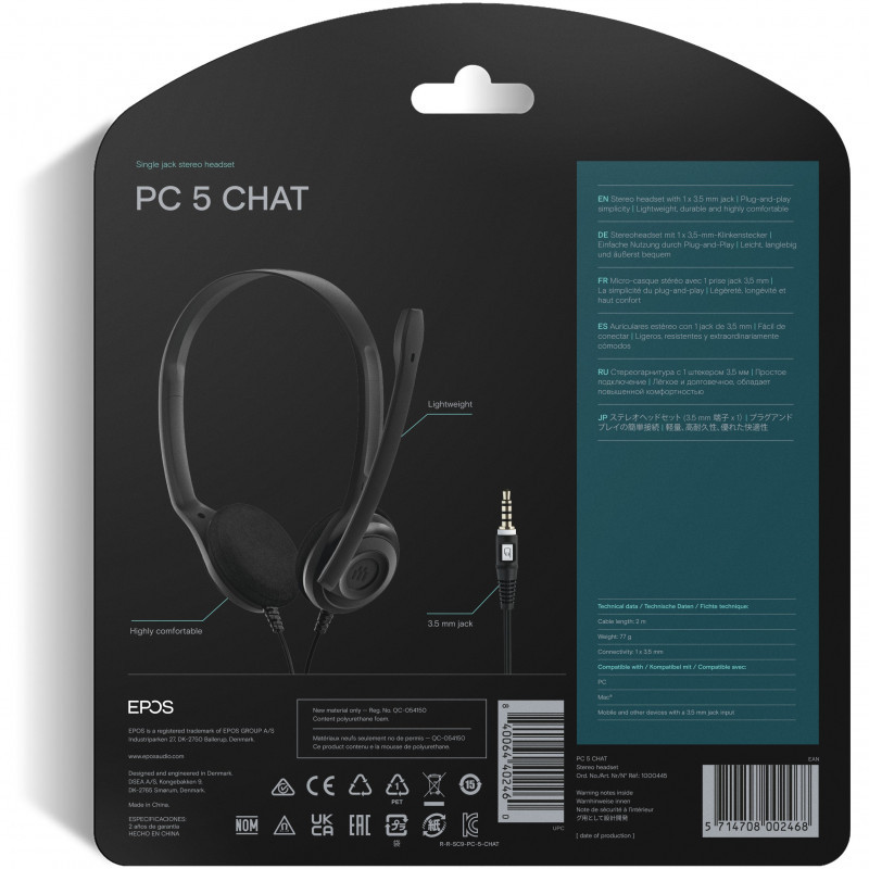 "Sennheiser PC 5 CHAT. Product type: Headset. Connectivity technology: Wired. Recommended usage: Office/Call center. Headphone frequency: 42 - 17000 Hz. Cable length: 2 m. Weight: 85.05 g. Product colour: Black"\n"The PC 5 Chat stereo headset delivers excellent sound while its passive noise-canceling microphone ensures clear conversation. The single 3.5 mm jack provides multi-connectivity with laptops, phones, PCs and tablets, and its durable lightweight design withstands the rigors of daily use."