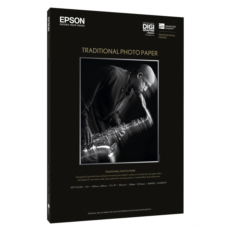 "Epson Traditional Photo Paper, DIN A4, 330g/m², 25 Sheets. Media weight: 330 g/m², Paper size: A4, Sheets per pack: 25 sheets. Quantity per pack: 1 pc(s), Package width: 225 mm, Package depth: 310 mm. Products per pallet: 1 pc(s), Products per master (outer) case: 10 pc(s). Country of origin: Switzerland"\n"Epson Traditional Photo Paper is a breakthrough paper, designed exclusively for use with Epson's UltraChrome K3 ink, developed in collaboration with many of the industry's leading professional photographers to ensure it meets their most discerning requirements.Many who have contributed to the development of Traditional Photo Paper have commented that it reminds them of revered silver halide papers as well as providing greater creative control due to extraordinary D-Max and tonal transition in black and white. You can also print extraordinary colour with the same paper -something that was not possible with traditional fibre based papers.Combining the artistry of traditional photography with the ease and control of digital output, this unique media offers the same deep blacks, subtle tonal gradations and long-lasting results as the darkroom papers from previous generations. Its fibre base has a rich surface, a continuous tone and soft gloss that are ideal for creating stunning colour or neutral black and white prints that retain the look and feel of traditional fiber paper.Like all Epson innovative media, this paper is engineered to give you the highest resolution and colour saturation possible. As always, Epson supplies guarantees Epson quality."