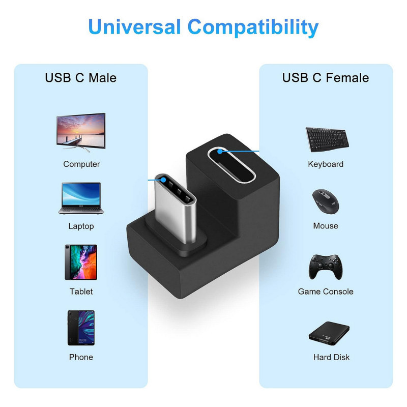 Engineered for durability, the USB-C 180 Degree Adapter is constructed from high-quality materials that ensure long-lasting performance. It supports fast data transfer rates and high-speed charging, providing both convenience and efficiency for users on the go. This adapter is perfect for use in a variety of settings, including home offices, professional workspaces, and travel environments, where space constraints can often be a challenge."