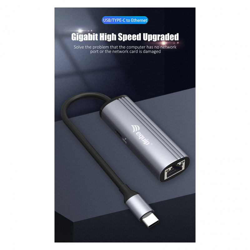 "Equip USB-C to RJ45 Gigabit Network + PD Adapter. Host interface: USB Type-C, USB Power Delivery up to: 100 W. Ethernet LAN data rates: 10,100,1000 Mbit/s. Product colour: Black, Grey, Hub interfaces: RJ-45, USB 3.2 Gen 1 (3.1 Gen 1) Type-C, Housing material: Aluminium. Windows operating systems supported: Windows 10, Windows 10 Education, Windows 10 Education x64, Windows 10 Enterprise, Windows 10..., Mac operating systems supported: Mac OS X 10.10 Yosemite, Mac OS X 10.11 El Capitan, Mac OS X 10.12 Sierra, Mac OS X 10.13 High..., Other operating systems supported: Android. Width: 25 mm, Depth: 17.8 mm, Height: 81 mm"\n"The equip® 133486 USB PD (Power Delivery) and Gigabit Ethernet Combo Adapter USB-C to Ethernet adapter provides reliability of Ethernet for your USB-C device. Where wireless connectivity is inconsistent, overextended, or even non-existent, this adapter allows you to connect seamlessly and with confidence. With the speed and reliability of Gigabit Ethernet, even the largest downloads can be possible without fear of interruption . In the same time can charge your laptop via the USB-C PD (Power Delivery)