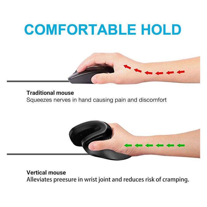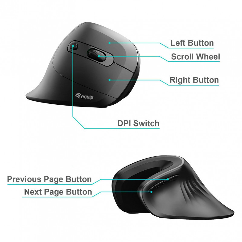 "Equip 245119. Form factor: Right-hand, Vertical design. Movement detection technology: Optical, Device interface: USB Type-A + USB Type-C, Movement resolution: 7200 DPI, Buttons type: Pressed buttons, Buttons quantity: 6, Scroll type: Wheel. Power source: Cable. Product colour: Black"\n"The Equip 245118 Vertical Ergonomic Wired Mouse is designed to provide optimal comfort and support for your hand, wrist, and forearm, making it an ideal choice for long hours of computer use. Unlike traditional mice, this vertical design promotes a natural handshake position that helps reduce strain and prevent repetitive stress injuries like carpal tunnel syndrome. Its contoured shape fits comfortably in your hand, allowing for precise control with minimal effort.