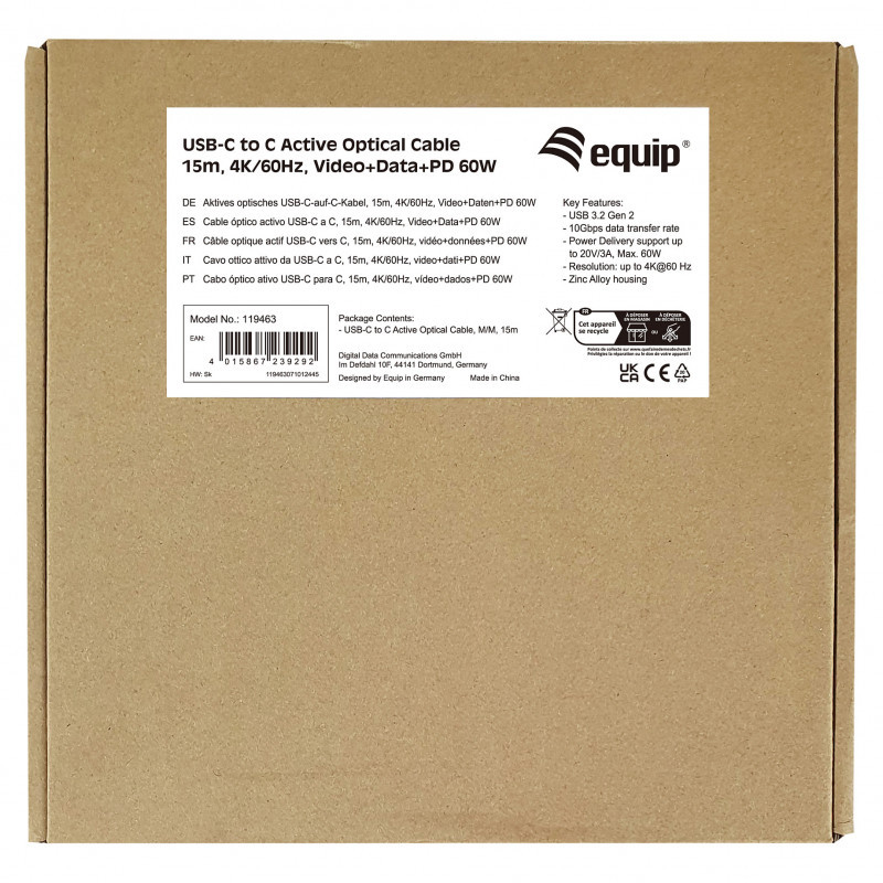 "Equip USB-C to C Active Optical Cable, M/M, 15m, PD 60W, 4K/60Hz, 10Gbps, Video+Data+PD. Cable length: 15 m. Connector 1: USB C, Connector 2: USB C, USB version: USB 3.2 Gen 2 (3.1 Gen 2), Maximum data transfer rate: 10 Gbit/s, Connector contacts plating: Gold, Product colour: Black"\n"The equip 119463 Active Optical USB-C to C Video+Data+PD Cable is a allows for video output. It uses active optical technology to ensure that signals are transmitted with minimal interference and loss over longer distances than traditional cables. The cable is compatible with USB-C devices such as laptops, tablets, and smartphones and can be used for a variety of purposes displaying video content on external monitors.