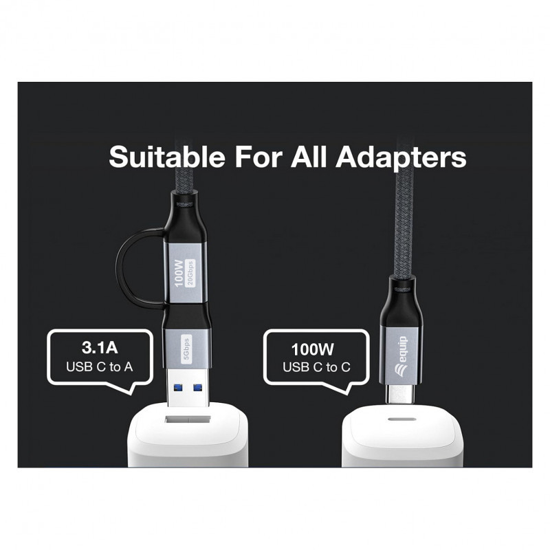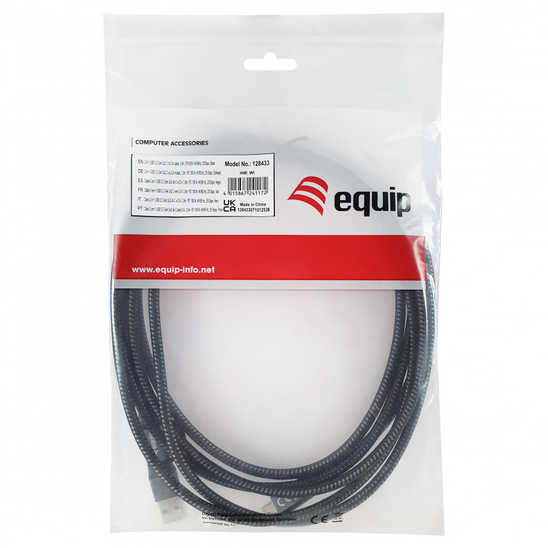"Equip 128433. Cable length: 3 m. Connector 1: USB A/USB C, Connector 2: USB C, USB version: USB 3.2 Gen 2x2, Maximum data transfer rate: 20 Gbit/s, Connector contacts plating: Gold, Product colour: Black"\n"The equip high-performance connectivity with the 2-in-1 USB 3.2 Gen 2x2 C to C/A Cable, designed for maximum versatility and speed. This premium-grade 3.0-meter cable supports blazing-fast data transfer rates up to 20Gbps, ideal for transferring large files, 4K media, and fast backups. With built-in support for Power Delivery (PD) up to 100W, it ensures rapid charging for laptops, tablets, and smartphones, meeting the power demands of today's high-performance devices.