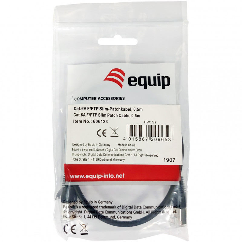 "Equip Cat.6A F/FTP Slim Patch Cable, 0.5m, Black. Cable length: 0.5 m, Cable standard: Cat6a, Cable shielding: F/FTP (FFTP), Connector 1: RJ-45, Connector 2: RJ-45, Connector contacts plating: Gold, Data transfer rate: 10000 Mbit/s, Product colour: Black"\n"The equip® Cat.6A F/FTP Slim Patch Cable is a small cable with big performance. With a cable diameter of almost half a standard Cat.6A cable, It's easier to route and saves valuable space in high density environments, such as data centers and telecommunications rooms. With Cat.6A Slim Cable, you can fit more cables in the same space, saving you the time and cost of expanding or replacing cable pathways."