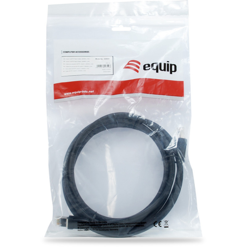 "Equip Cat 8.1 S/FTP (PIMF) Patch Cable, LSOH, 0.5m, Black. Cable length: 0.5 m, Cable standard: Cat8.1, Cable shielding: S/FTP (S-STP), Connector 1: RJ-45, Connector 2: RJ-45, Connector contacts plating: Gold, Data transfer rate: 40000 Mbit/s, Product colour: Black"\n"The equip® Cat 8.1 S/FTP Patch Cord is composed of preeminent materials and fully-examined to conform with industrial standards. Offering higher bandwidth and better signal-to-noise margin, the Cat 8.1 cable is able to deliver ultrahigh and error-free performance in the most demanding network environments, specially for 40G application."