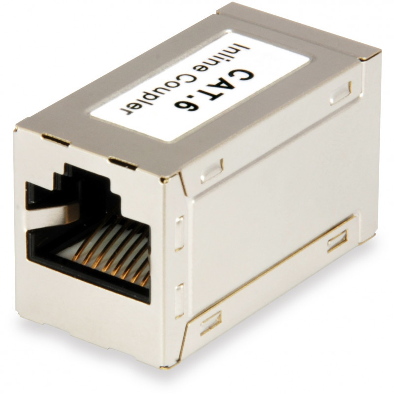 "Equip Cat.6 Shielded Modular Inline Coupler, Shielded. Connector 1: RJ-45, Connector 2: RJ-45, Connector contacts plating: Gold. Product colour: Silver"\n"The equip® Inline Coupler features two RJ45 jacks, designed to bridge two RJ45 cables together. The connector is fully shielded and with gold flash contact to guarantee an error-free Cat.6 cabling system. "