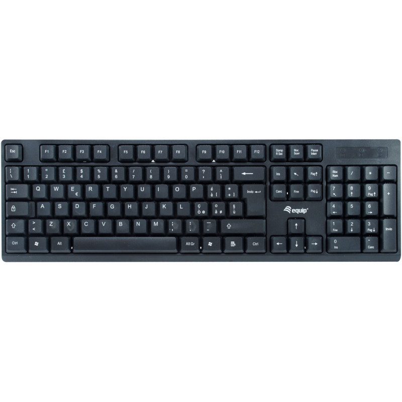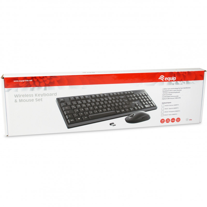 "Equip Wireless Keyboard & Mouse Set, IT Layout. Keyboard form factor: Full-size (100%). Keyboard style: Straight. Connectivity technology: Wireless, Device interface: RF Wireless, Keyboard layout: QWERTY, Keyboard number of keys: 105, Recommended usage: Office. Product colour: Black. Mouse included"\n"This wireless keyboard and mouse combination is an essential companion for the home or office. Simply plug and play to get easy, seamless performance from your devices. The standard keyboard features a full suite of 105 soft-touch keys for accurate, comfortable typing.