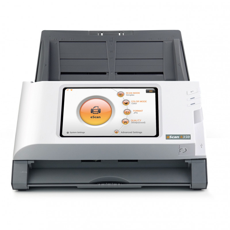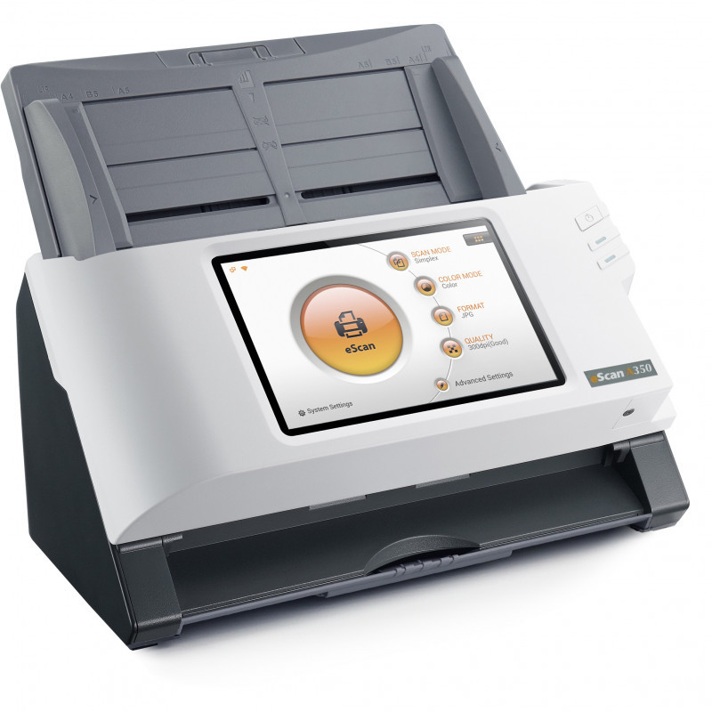 "Plustek eScan A350 Essential. Maximum scan size: 216 x 5080 mm, Optical scanning resolution: 600 x 600 DPI, Input colour depth: 48 bit. Scanner type: ADF scanner, Product colour: Black, White, Display: LED. Sensor type: Dual CIS, Daily duty cycle (max): 6000 pages, Scan to: Cloud, E-mail, FTP, PC, SMB, USB. Auto document feeder (ADF) input capacity: 50 sheets. Maximum ISO A-series paper size: A4, Auto Document Feeder (ADF) media weight: 40 - 157 g/m², Maximum scan area (ADF): 216 x 356 mm"\n"Standalone Network Scanner No PC required
