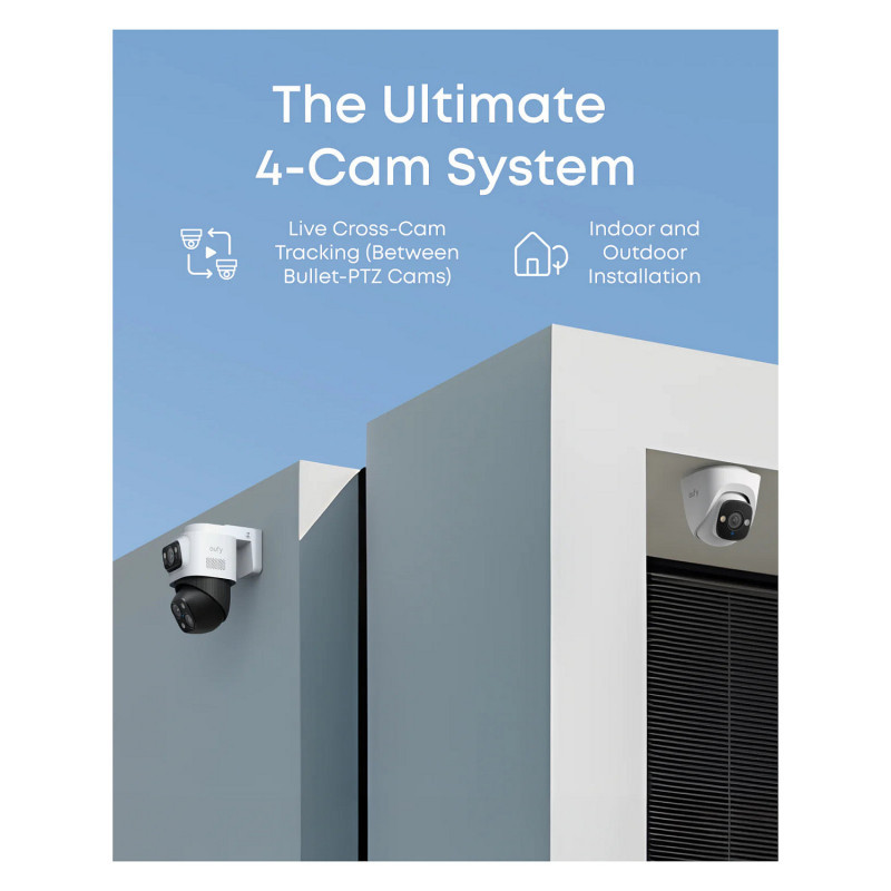 "Eufy NVR Security System S4 Max. Video input channels: 8 channels, Maximum resolution: 3840 x 2160 pixels. HDD capacity: 2 TB, Maximum storage capacity: 16 TB. Brand compatibility: Eufy, Product colour: Black, Grey, White"\n"- 16 MP Triple-Lens Bullet-PTZ Camera: The upper 4K wide-angle camera provides a 122° fixed view of the entire scene, while the lower 2K PTZ camera features 8× auto-zoom and 360° pan for complete coverage.