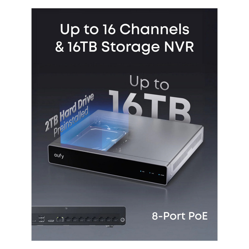 - Expandable Security, Effortless Setup: 8-channel surveillance that can be easily expanded to 16. Includes a pre-installed 2 TB HDD (upgradeable to 16 TB) for 24/7 recording. Plug and play design with one PoE cable for power and video, making eufy camera and smart assistant integration seamless.