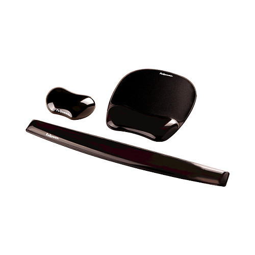 "Fellowes Mouse Mat Wrist Support - Crystals Gel Mouse Pad with Non Slip Rubber Base - Ergonomic Mouse Mat for Computer, Laptop, Home Office Use - Compatible with Laser and Optical Mice - Black. Width: 202 mm, Depth: 230 mm. Product colour: Black, Surface coloration: Monochromatic, Material: Gel, Plastic, Wrist rest"\n"This self adjusting gel mouse mat with wrist support allows personalised comfort as the wrist rest has the ability to conform to your wrist, which helps relieve pressure and fatigue whilst using your mouse. With the easy clean surface, the design allows you to wipe the mouse pad clean with a damp cloth, making it ideal for all environments. To prevent frustration in the workplace or at home, Fellowes have incorporated a non-skid rubber backing to the mouse mat which keeps wrist rest in place and prevents it from slipping around. Fellowes understand that bad working habits cause many of us physical health problems and fatigue. By using this knowledge Fellowes have created a comprehensive range of ergonomic solutions like this designed mouse mat, that help you enjoy a more comfortable and productive workspace."