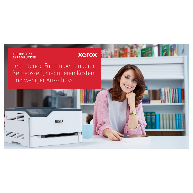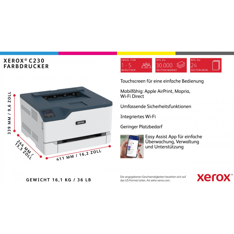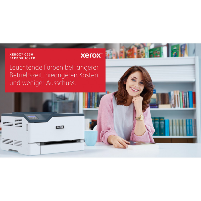 "Xerox C230 A4 22ppm Wireless Duplex Printer PS3 PCL5e6 2 Trays Total 251 Sheets. Print technology: Laser, Colour. Number of print cartridges: 4, Maximum duty cycle: 30000 pages per month. Maximum resolution: 600 x 600 DPI. Maximum ISO A-series paper size: A4. Print speed (black, normal quality, A4/US Letter): 22 ppm, Duplex printing. Display: LCD. Wi-Fi. Product colour: Blue, White"\n"The affordable Xerox C235 Color Printer is built for fast, nimble offices and home offices that need a color printer that can keep up with them. Easy to set up with Xerox® Smart Start Software and ready to work hard right out of the box. This device was designed for high-demand print environments, with an easy to use interface, automatic 2-Sided printing on letter and legal size paper with standard paper capacity of 250 sheets. Built-in wireless and Wi-Fi Direct functioN/Ality lets you print directly from mobile devices and tablets. Designed with a recommended monthly print volume of up to 1,500 pages per month, a 1 GHz dual core processor, 256 MB memory, and print speeds up to 24 Letter pages per minute/ 22 A4 pages per minute the C230 is a workhorse. Achieving EPEAT certification means the C230 Color Printer meets comprehensive criteria for design, production, energy use, and recycling. And our Green World Alliance program offers hassle-free toner cartridge recycling. With N-up printing multiple pages are reduced in size and then printed on a single sheet of paper. This feature is especially useful when outputting presentations or numerous thumbN/Ail images, or when trying to conserve paper."