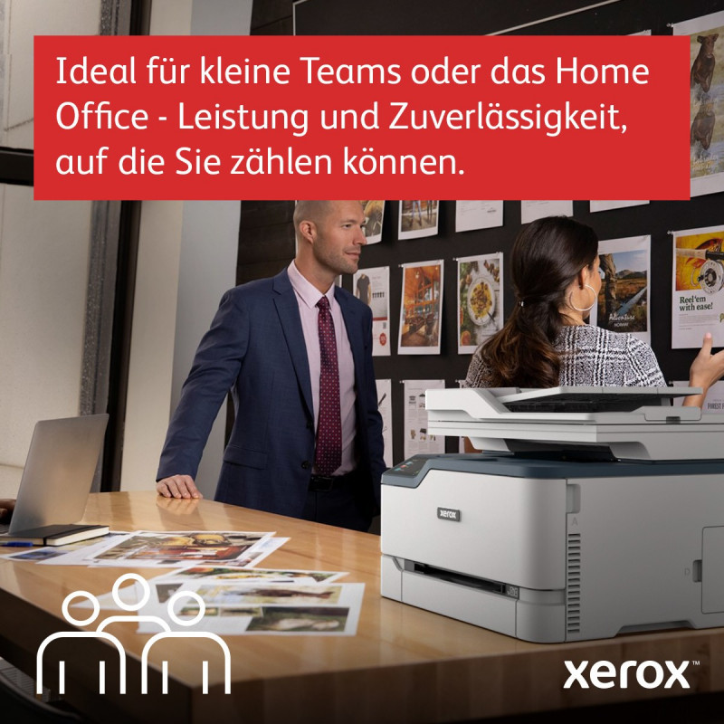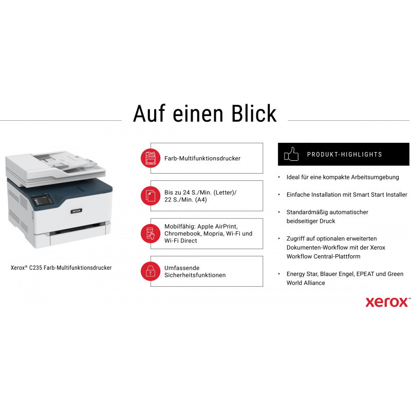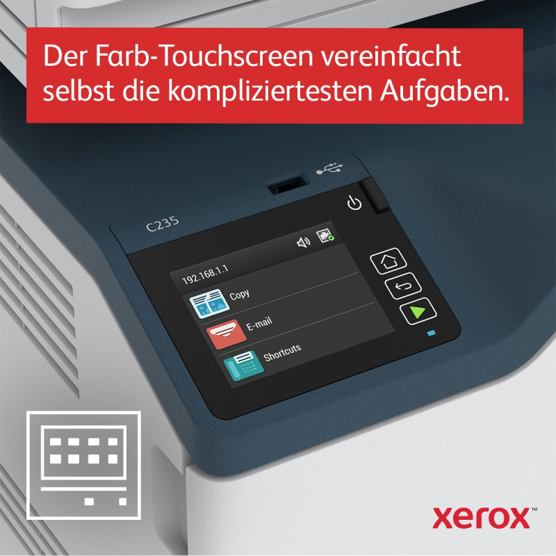 "Xerox C235 A4 22ppm Wireless Copy/Print/Scan/Fax PS3 PCL5e/6 ADF 2 Trays Total 251 Sheets. Print technology: Laser, Printing: Colour printing, Maximum resolution: 600 x 600 DPI, Print speed (colour, normal quality, A4/US Letter): 22 ppm. Copying: Colour copying, Maximum copy resolution: 600 x 600 DPI. Scanning: Colour scanning, Optical scanning resolution: 600 x 600 DPI. Faxing: Mono faxing. Duplex functions: Copy, Fax, Print. Maximum ISO A-series paper size: A4. Wi-Fi. Direct printing. Product colour: Blue, White"\n"The affordable Xerox C235 Color Multifunction Printer is built for fast,nimble offices and home offices that need a color printer that can keep up with them. Easy to set up with Xerox® Smart Start Software and ready to work hard right out of the box. This device was designed for high-demand print environments, with 2.4-inch color touchscreen user interface, 50-sheet automatic document feeder, automatic 2-Sided printing on letter and legal size paper with standard paper capacity of 250 sheets. Built-in wireless and Wi-Fi Direct functioN/Ality lets you print directly from mobile devices and tablets. Designed with a recommended monthly print volume of up to 1,500 pages per month, a 1 GHz dual core processor, 512 MB memory, and print speeds up to 24 Letter pages per minute/ 22 A4 pages per minute the C235 is a workhorse. Do more with optioN/Al Xerox Workflow Central, allowing you to convert documents into other languages, change handwriten messages into shareable text documents, create audio files of hardcopy to listen to on the go, automatically redact content, and convert scans into Microsoft Office Applications. Achieving EPEAT certification means the C235 meets comprehensive criteria for design, production, energy use, and recycling. And our Green World Alliance program offers hassle-free toner cartridge recycling."