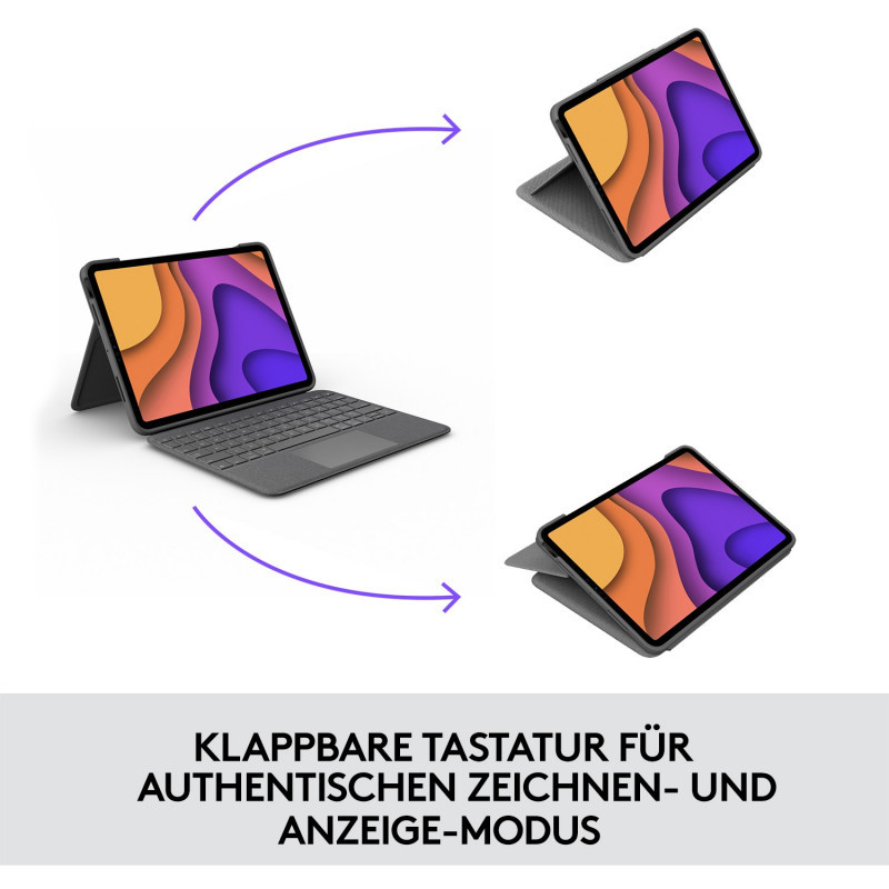 "Logitech Folio Touch for iPad Air (4th & 5th generation). Keyboard layout: QWERTZ, Keyboard language: Swiss, Pointing device: Trackpad. Brand compatibility: Apple, Compatibility: iPad Air (4th gen, 5th gen), Product colour: Grey. Connectivity technology: Wireless, Device interface: Smart Connector. Power source: Dock. Mobile operating systems supported: iPadOS"\n"One case to do it all. Type, sketch, view, and read with the Folio Touch keyboard case for iPad Air® (4th gen), featuring four versatile use modes, a high-precision trackpad for unparalleled control, and a laptop-like keyboard for comfortable, accurate typing.