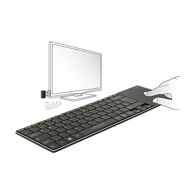 "DeLOCK 12454. Pointing device: Touchpad. Brand compatibility: Any brand, Product colour: Black, Housing material: Aluminium. Connectivity technology: Wired, Device interface: Micro-USB, Frequency band: 2.4 GHz. Power source: Battery, Battery technology: Lithium-Ion (Li-Ion), Battery capacity: 190 mAh. Windows operating systems supported: Windows 10 Education, Windows 10 Education x64, Windows 10 Enterprise, Windows 10 Enterprise x64,..."\n"This wireless keyboard by Delock is suitable for Smart TVs as well as for PCs or laptops with Windows operating system. The touchpad allows using the mouse function (cursor) on the TV in order to surf easily e.g. through the internet. Using the keyboard on the PC it can replace the standard keyboard and mouse."