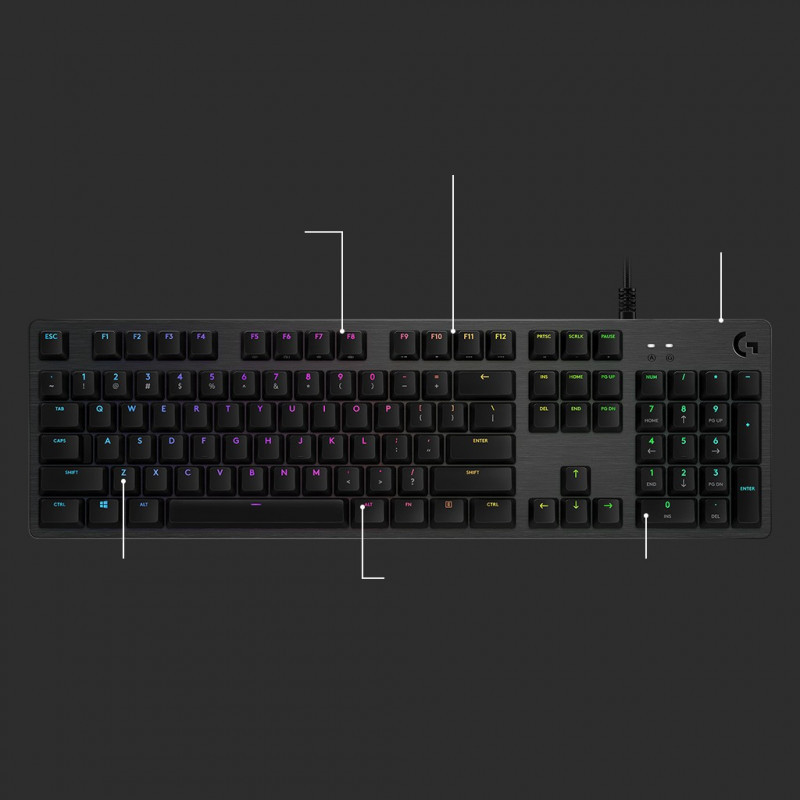 "Logitech G G512 Carbon, GX Red. Keyboard form factor: Full-size (100%). Keyboard style: Straight. Connectivity technology: Wired, Device interface: USB, Keyboard key switch: Mechanical. Backlight type: RGB LED. Cable length: 1.8 m. Recommended usage: Gaming. Product colour: Carbon"\n