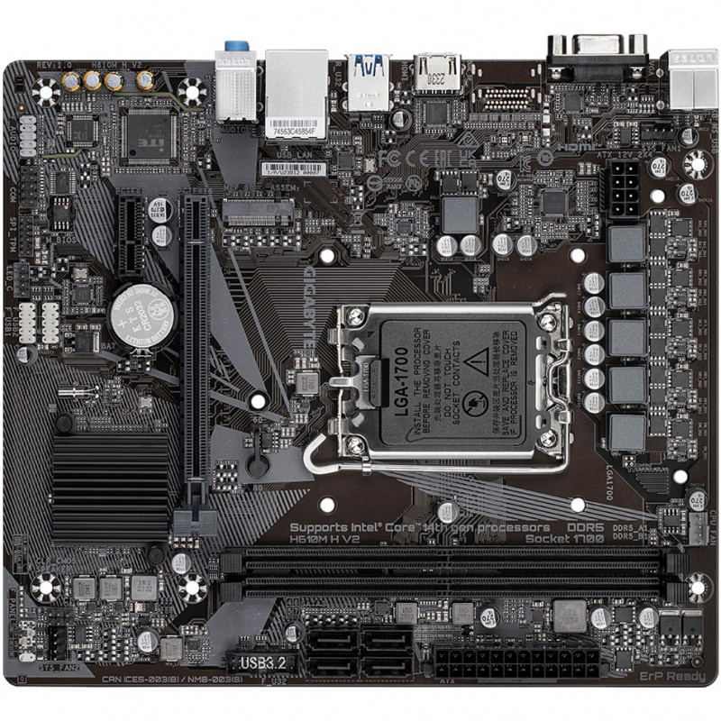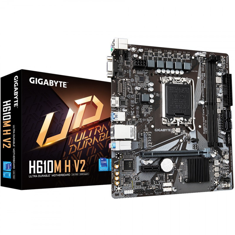 "GIGABYTE H610M H V2 Motherboard - Supports Intel Core 14th CPUs, 4+1+1 Hybrid Digital VRM, up to 5600MHz DDR5, 1xPCIe 3.0 M.2, GbE LAN, USB 3.2 Gen 1. Processor manufacturer: Intel, Processor socket: LGA 1700, Compatible processor series: Intel® Celeron®, Intel® Core™ i3, Intel® Core™ i5, Intel® Core™ i7, Intel® Core™ i9,.... Supported memory types: DDR5-SDRAM, Maximum internal memory: 96 GB, Memory slots type: DIMM. Supported storage drive interfaces: M.2, SATA III, Supported storage drive types: HDD & SSD. Graphics card family: Intel, Graphics card: HD Graphics, Maximum resolution: 4096 x 2304 pixels. USB connector type: USB Type-A"\n"Elevate your computing experience with GIGABYTE's renowned motherboard series: AORUS, AERO, and GIGABYTE. Featuring innovative designs and advanced features, these boards offer exceptional performance and reliability. Whether you're a gamer, content creator, or professional, our series cater to your needs, ensuring uncompromising quality and cutting-edge"