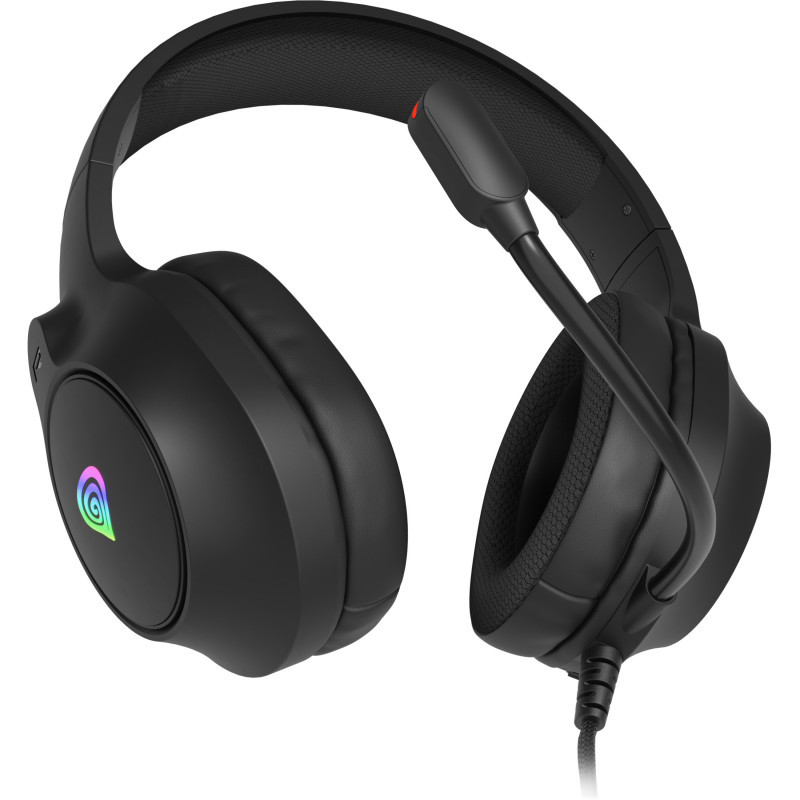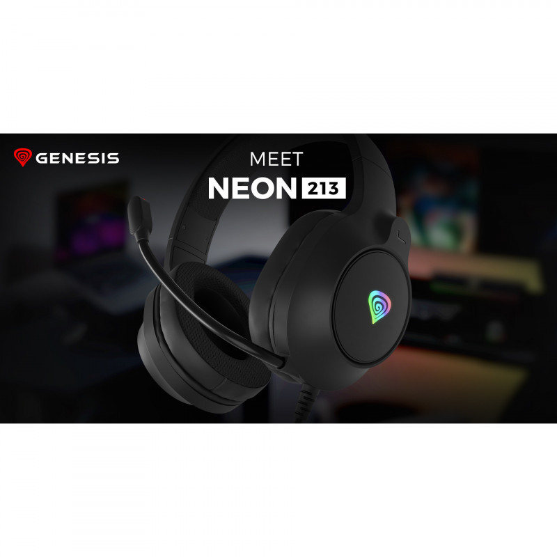 "GENESIS NEON 213. Product type: Headset. Connectivity technology: Wired. Recommended usage: Calls/Music. Headphone frequency: 20 - 20000 Hz. Cable length: 2.2 m. Weight: 302 g. Product colour: Black"\n"The Neon 213 headphones are an excellent choice for gamers who appreciate comfort, style and good sound quality at an affordable price. Made of modern materials and equipped with striking RGB backlighting, they will perfectly complement any gaming setup. Built-in microphone and intuitive operation make this model successfully meet the expectations of even demanding users.