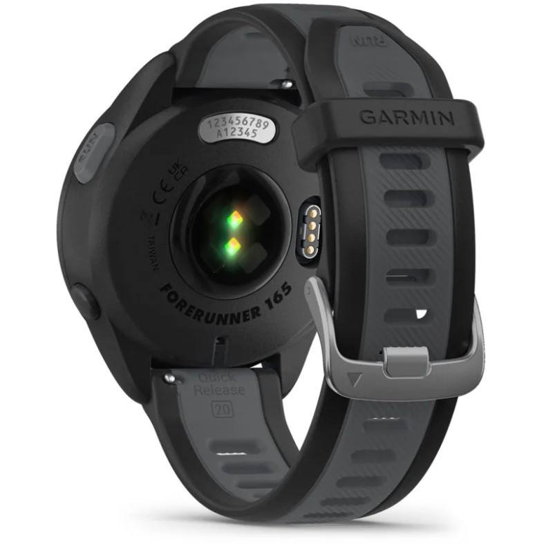 "Garmin Forerunner 165. Display diagonal: 3.05 cm (1.2""), Display technology: AMOLED, Display resolution: 390 x 390 pixels, Touchscreen. Flash memory: 4 GB. GPS (satellite). Weight: 39 g. Band material: Silicone, Band colour: Black, Grey"\n"TRAIN BRILLIANTLY