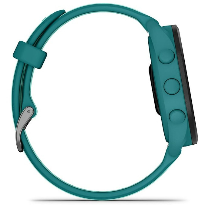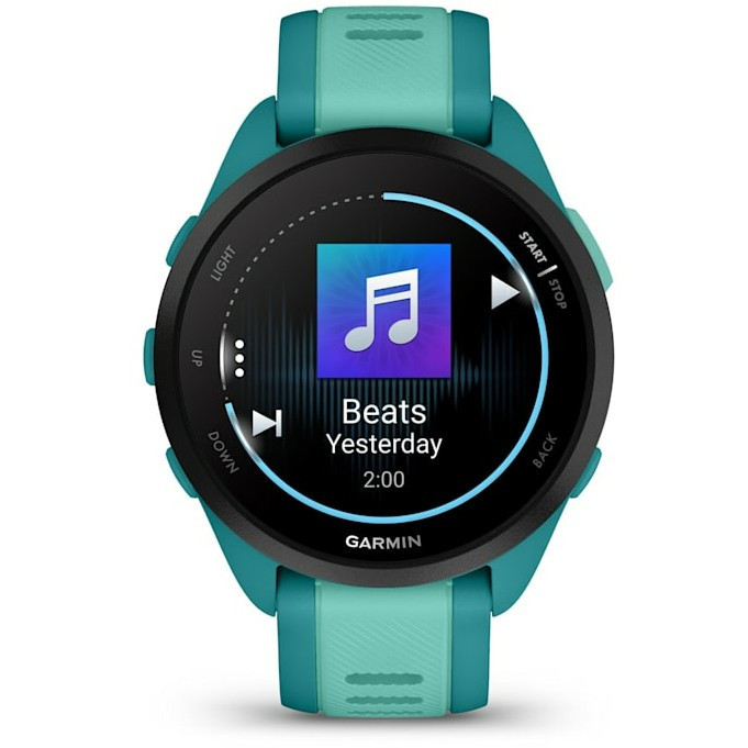 "Garmin Forerunner 165 Music. Display diagonal: 3.05 cm (1.2""), Display technology: AMOLED, Display resolution: 390 x 390 pixels, Touchscreen. Flash memory: 4 GB. GPS (satellite). Weight: 39 g. Band material: Silicone, Band colour: Blue, Turquoise"\n"TRAIN BRILLIANTLY