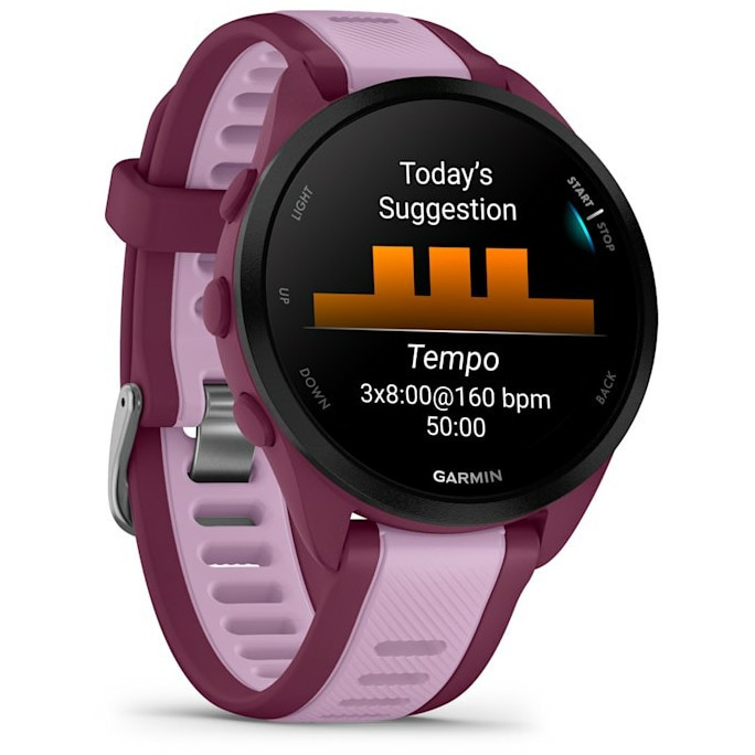 "Garmin Forerunner 165 Music. Display diagonal: 3.05 cm (1.2""), Display technology: AMOLED, Display resolution: 390 x 390 pixels, Touchscreen. Flash memory: 4 GB. GPS (satellite). Weight: 39 g. Band material: Silicone, Band colour: Light purple, Purple"\n"TRAIN BRILLIANTLY