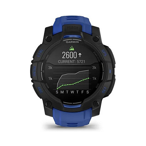 "Garmin Instinct 3. Display diagonal: 3.05 cm (1.2""), Display technology: AMOLED, Display resolution: 390 x 390 pixels. GPS (satellite). Weight: 53 g. Band material: Silicone, Band colour: Black, Blue"\n"TOUGH IT OUT