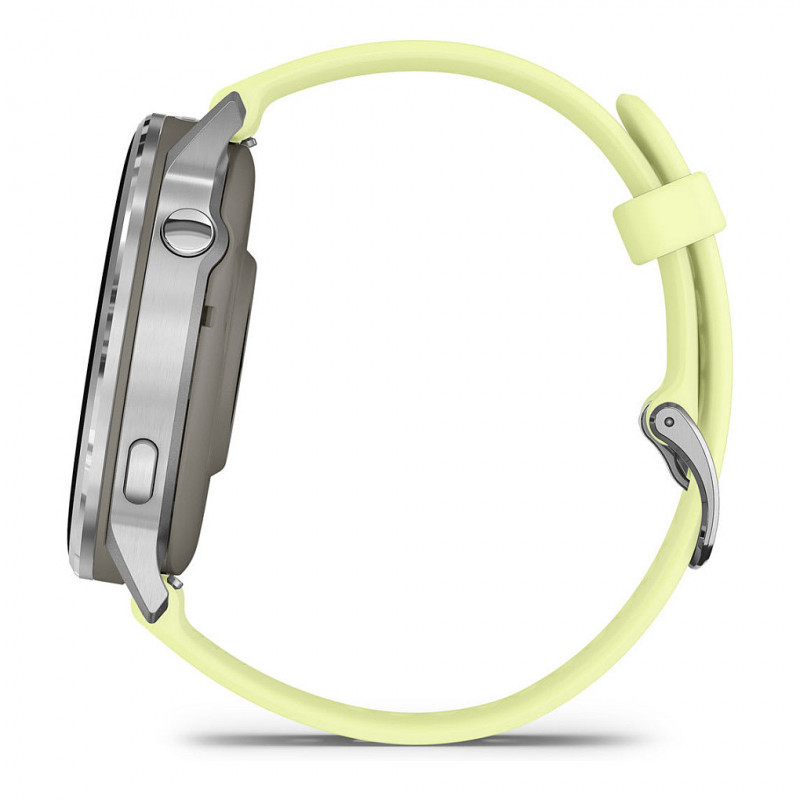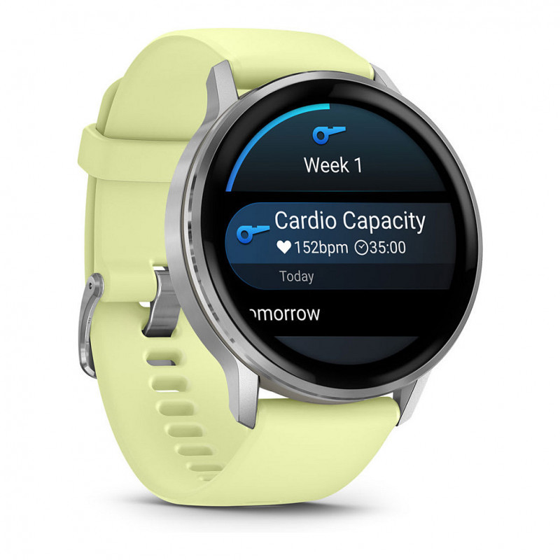 "Garmin Venu 010-03014-02. Display diagonal: 3.56 cm (1.4""), Display technology: AMOLED, Display resolution: 454 x 454 pixels, Touchscreen. Flash memory: 8 GB. Wi-Fi. GPS (satellite). Weight: 38 g. Band material: Silicone"\n"VENU 4