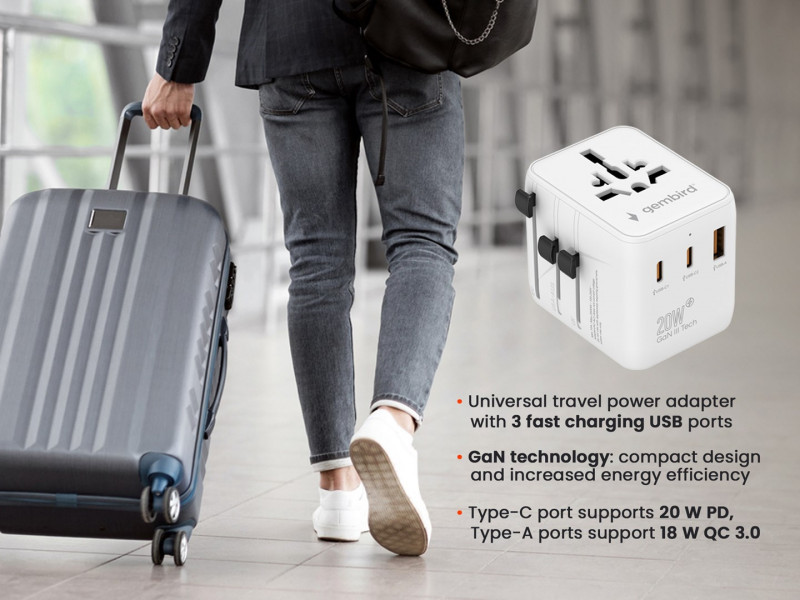 Gembird TPA-1A2C20-01-W universalus kelioninis maitinimo adapteris, 20 W, baltas