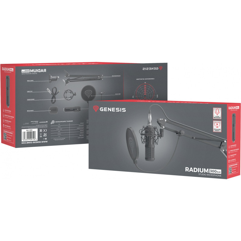 "GENESIS Radium 300 XLR. Type: Studio microphone, Microphone sensitivity: -38 dB, Microphone frequency: 30 - 16000 Hz. Connectivity technology: Wired. Product colour: Black, Housing material: Metal, Cable length: 2.5 m. Power source: XLR. Microphone weight: 341 g"\n"Meet Genesis Radium 300 XLR high-end studio microphone, which has been designed for beginners, professional streamers, youtubers and vloggers. The microphone guarantees the highest level of transmitted sound, thus ensuring phenomenal recordings, free of unwanted disturbances and noises from the surroundings A wide range of included accessories makes Radium 300 XL unrivalled in its category. Raise your game with Genesis Radium 300 XLR.