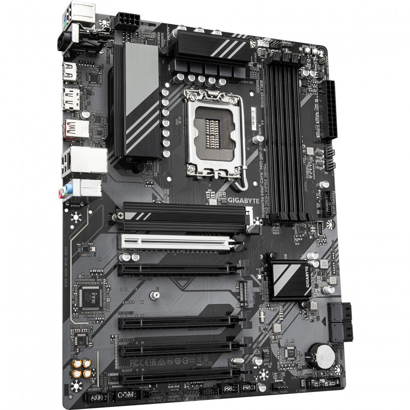"GIGABYTE B760 DS3H WIFI6E GEN5 Motherboard - Supports Intel Core 14th Gen CPUs, 8+2+1 Phases Digital VRM, up to 5600MHz DDR5, 2xPCIe 4.0 M.2, Wi-Fi 6E, 1GbE LAN, USB 3.2 Gen 2x2. Processor manufacturer: Intel, Processor socket: LGA 1700, Compatible processor series: Intel® Celeron®, Intel Core i3 12th Gen, Intel Core i3 13th Gen, Intel Core i3 14th Gen, Intel.... Supported memory types: DDR5-SDRAM, Maximum internal memory: 256 GB, Memory slots type: DIMM. Supported storage drive interfaces: M.2, PCI Express 4.0, SATA III, Supported storage drive types: HDD & SSD, RAID levels: 0, 1, 5, 10. Maximum resolution: 4096 x 2304 pixels. Ethernet interface type: Gigabit Ethernet, LAN controller: Realtek RTL8111H, Top Wi-Fi standard: Wi-Fi 6E (802.11ax)"\n"Elevate your computing experience with GIGABYTE's renowned motherboard series: AORUS, AERO, and GIGABYTE. Featuring innovative designs and advanced features, these boards offer exceptional performance and reliability. Whether you're a gamer, content creator, or professional, our series cater to your needs, ensuring uncompromising quality and cutting-edge technology."